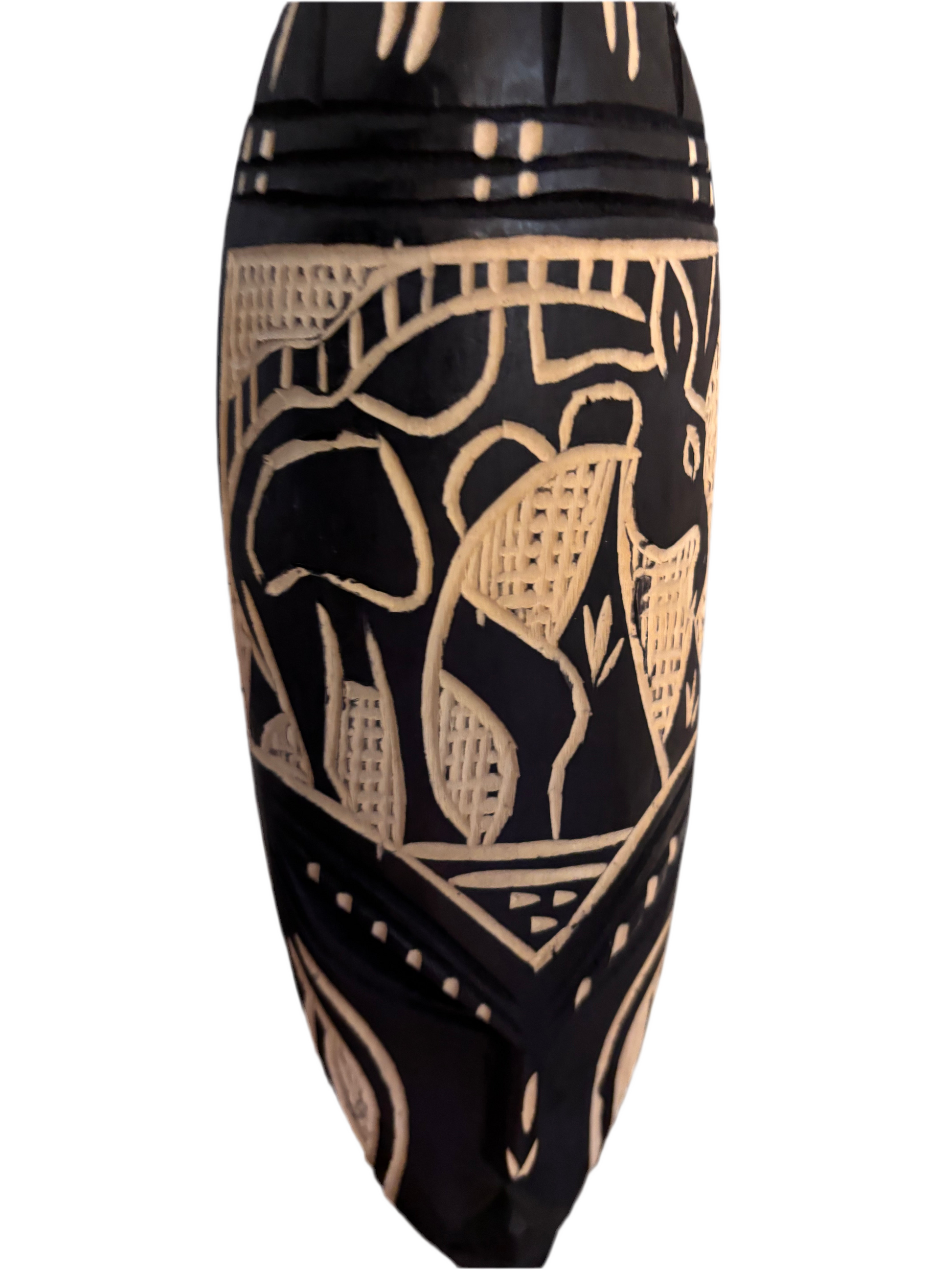 The mask holds deep cultural significance, showcasing traditional African design, storytelling, and spiritual expression. Its distinctive features and aged character speak to its historical value, making it a meaningful statement piece for collectors and admirers of authentic African art.